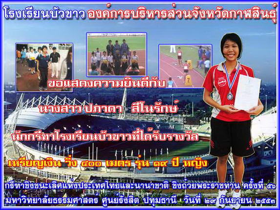 - วิ่ง ๔๐๐ เมตร หญิง รุ่นอายุไม่เกิน ๑๙ ปี ได้อันดับที่ ๒ ๖ ( ปภาดา สีโนรักษ์ )